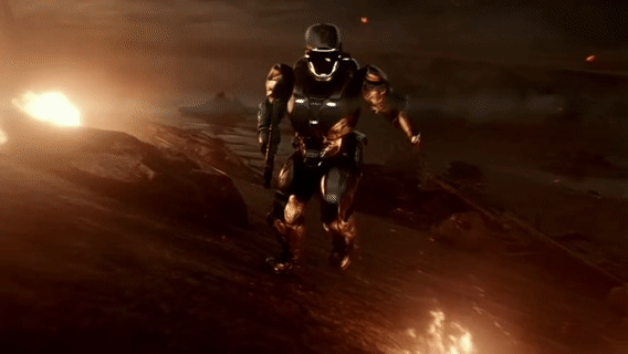 Prompt: exo-soldier in tactical armor, sprinting & vaulting over debris, steep dive-follow cam, plasma explosions, ember rain, dusk-orange haze with lens-flare