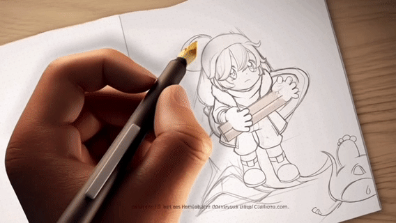 Prompt: A hand draws a character on paper — the camera swiftly dives into the page as the sketch gains dimension — in an instant, the world becomes vividly animated and three-dimensional, with the character stepping out of the drawing.