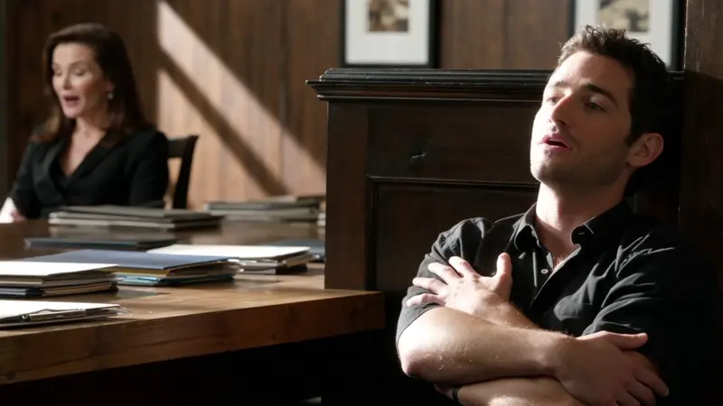 Keywords: artificial light, rim lighting, low saturation, indoor lighting, warm tones, over-the-shoulder shot, subject-focused