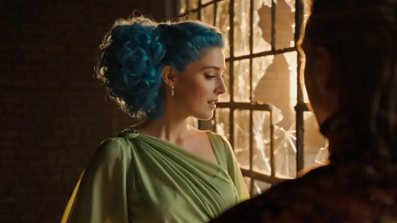 Rim light, side light, soft light, medium-close shot, dusk, sunset, centered composition, warm tones, low saturation, long focal length.A woman with voluminous blue curly hair stands gracefully before a large window. She wears a flowing pale green dress and has her hair neatly pulled back. Soft light from the window highlights her delicate features as she converses with someone off-camera. A touch of sadness in her eyes adds depth to her mysterious aura. The dim background with strong light contrast enhances emotional tension. The setting sun casts patterned light through the window, adding artistic and cinematic atmosphere.