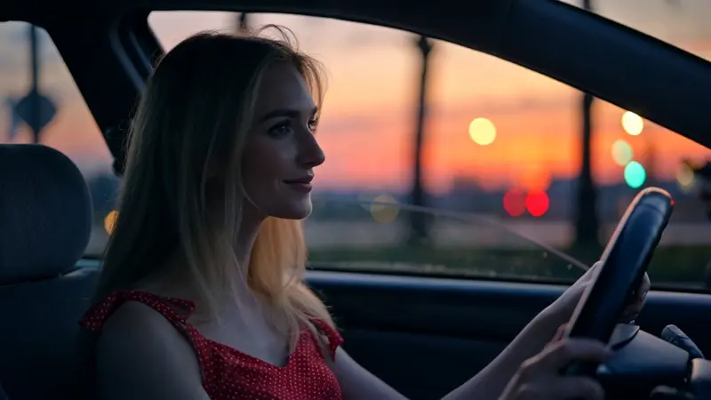 🌆 At dusk, a beautiful and alluring Caucasian woman in a red polka-dot dress sits in the driver’s seat of a car, hands firmly gripping the steering wheel. She gazes out the window with a natural smile. The light slants in from outside, softly illuminating the car interior while projecting faint silhouettes of city streets and passing pedestrians onto the glass. A medium shot captures the contrast between the car's cool-toned interior and the warm glow of the orange-red sunset outside, creating strong emotional resonance. The background is gently blurred, drawing focus to the woman's inner emotional world.