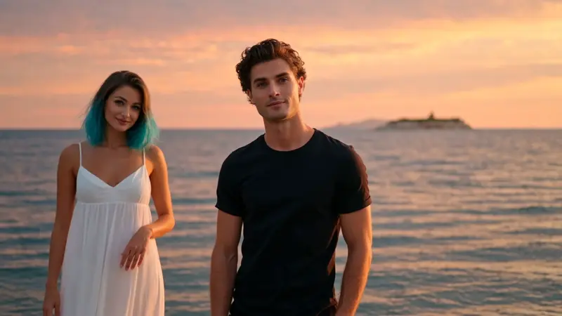 Dusk, sunset, side light, rim light, medium shot, centered framing, warm tones, soft light, low saturation.A clean two-person frame: a foreign man with curly brown hair and blue eyes stands center foreground in a black short-sleeved shirt, body slightly tilted right, gazing at the camera with a thoughtful expression. On the left, a woman with shoulder-length blue hair and blue eyes enters the frame. She wears a white long dress, smiling softly, her right hand resting gently on her left arm. The sea stretches behind them, with distant ships in soft focus. Warm sunset light casts rim lighting on their figures, creating a quiet yet intense atmosphere.