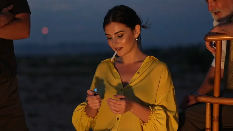 Under lighting, dawn, firelight, warm tones, low contrast, backlight, three-person framing.In a dark setting, a close-up of a foreign woman wearing yellow. She holds a cigarette in her left hand and a lighter in her right, lighting it before bringing it to her lips. Her gaze drops downward. On the left, a black silhouette with arms crossed watches her. On the right, an elderly figure observes intently.