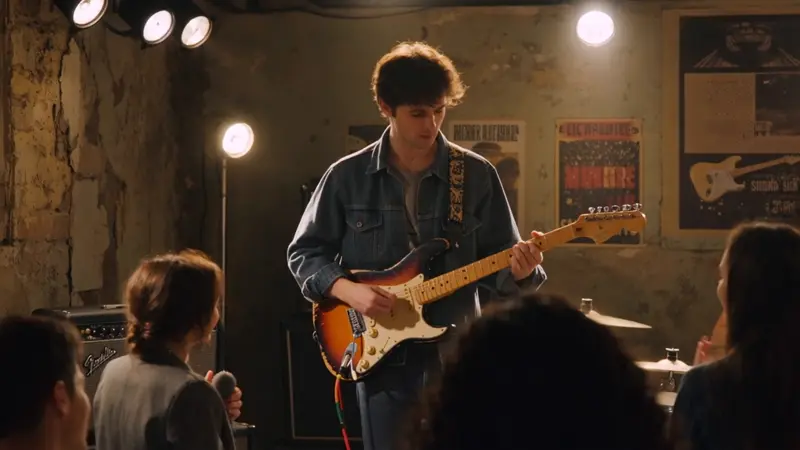 Low contrast.In a vintage 1980s music hall, a musician in a worn jacket plays guitar amid dim colors and coarse textures. A small crowd gathers to listen. The camera slowly pans right, capturing the blend of live music and cheers. Background details include old musical signage and weathered walls.