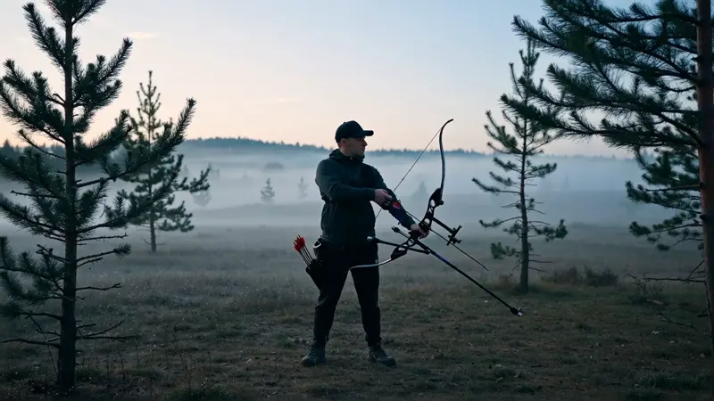 🌄 In the faint light of dawn, an archer in full gear trains in the misty woods. Shot from a side angle, the camera slowly zooms in to capture his piercing gaze and the taut string of his drawn bow. With a barely audible twang, the arrow launches, and the camera follows its flight at the moment of release. The left side of the frame anchors the composition, as the archer’s cold, focused demeanor is heightened by the cool color grading and low contrast. Sparse trees and grass frame the tranquil woodland in the background, evoking a sense of restrained tension just before the break of day.