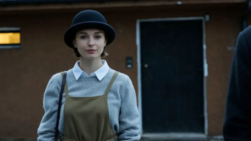 Medium-close shot, soft lighting, low contrast, rim light, low angle, overcast day, cool tones, centered composition. A foreign woman in khaki clothing and a gray sweater, wearing a black hat, walks slowly toward the camera. Behind her, a brown building with windows emitting yellow light; a blurred figure sways in the foreground, adding to the still yet story-rich atmosphere.
