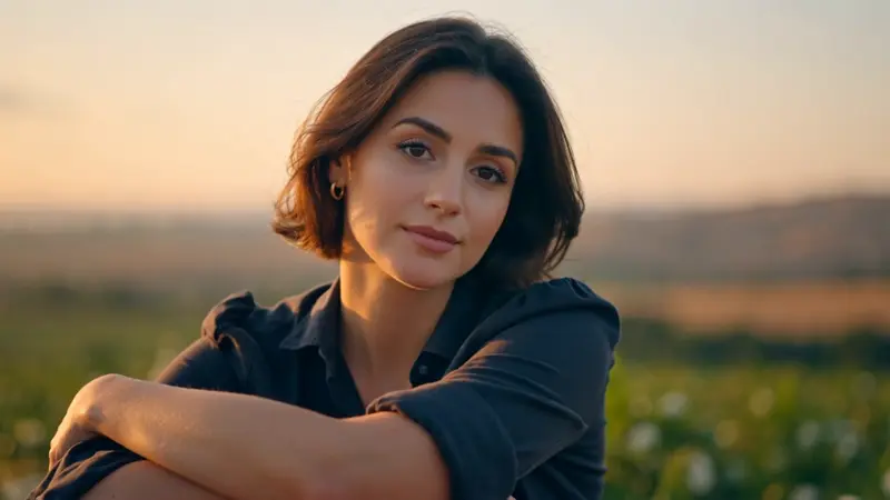 🌅 Early morning light breaks across the horizon as a beautiful and sensual woman sits at the edge of a field, wearing a dark cotton shirt with her hands naturally folded on her knees. The medium-close shot captures her leaning slightly forward, eyes firmly fixed on the distance, as if recalling a poignant memory. Soft morning rays enter from the left, gently illuminating the fine lines on her face, while a warm rim light outlines her figure. The sky transitions between soft orange and pale yellow, and the defocused field behind her creates a solemn, tranquil portrait that feels frozen in time.