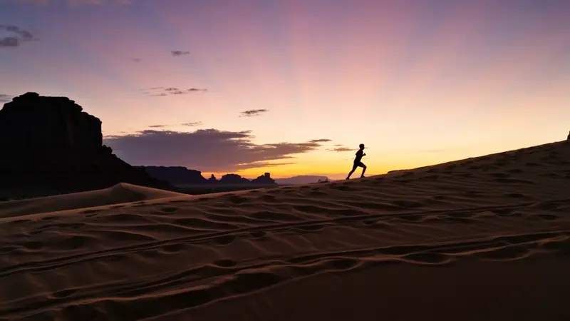 Dusk, silhouette, mixed tones, wide shot, establishing shot, high contrast.A runner crosses the desert. The camera slowly pans right as the figure begins climbing a sand dune. The lone silhouette persists through rough terrain with steady steps. The background shifts from rolling dunes to steep cliffs, emphasizing the journey’s difficulty. The runner remains centered, the camera steady, with no abrupt changes.