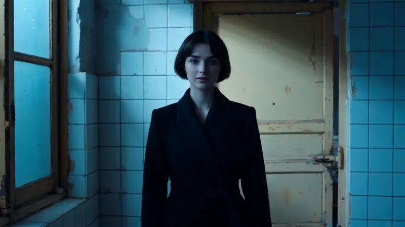 A young woman stands quietly in a worn-out interior, with chipped white tiles and a cracked wooden door behind her. Her sharp short haircut, dark hair, and icy blue eyes reflect the cold moonlight from outside. Wearing a black top with a crisp white collar, her posture slightly tilted, she appears to be listening intently to a silent voice. Her lips are pressed together, revealing suppressed yet intense emotion. Moonlight casts soft, layered shadows across her face, creating a restrained yet powerful tension. The close-up focuses on her expression, capturing a private, frozen, and cinematic moment.