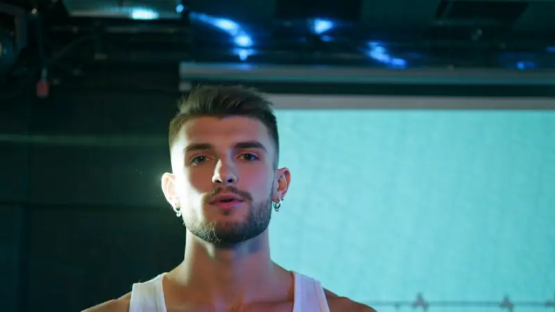 High contrast, under lighting, mixed tones, cool colors, close-up, side lighting. A foreign man stands in front of a projection screen in a dim room, wearing a white tank top and silver earrings. He gazes into the distance with a thoughtful look. As the camera pans right, blue and purple lights blend behind him, casting colored highlights across his face, enhancing his features and the dreamlike quality.