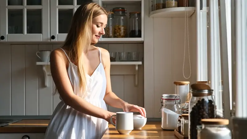 Early morning sunrise, warm sunlight, kitchen setting, mid-shot. A blonde white woman in a clean white outfit carefully prepares a drink. In a calm domestic scene, she opens a sugar jar, scoops some sugar into a white mug. On the table: spice jars. Background: slightly blurred, with soft floral wallpaper and a white cabinet filled with jars. Gentle sunlight filters through the window, adding warmth and stillness to the morning mood.