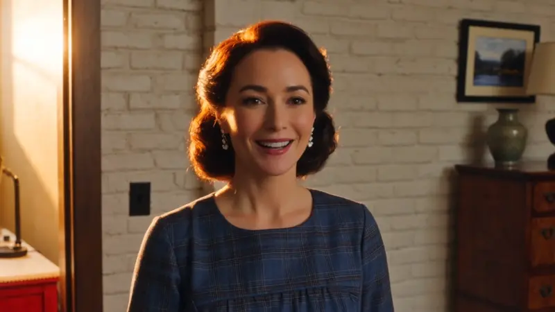 High contrast, high saturation, rule-of-thirds composition, sunset, mid focal length, soft light, backlighting, rim light, warm tones, medium-close shot, natural daylight.A close-up of a white woman in a blue checkered dress with earrings. As the camera pulls back, she walks forward smiling and speaking. The blurred background reveals a white brick wall with a painting, a wooden cabinet with a lamp and flowers, a red dresser with another lamp, and an open door letting in sunlight.