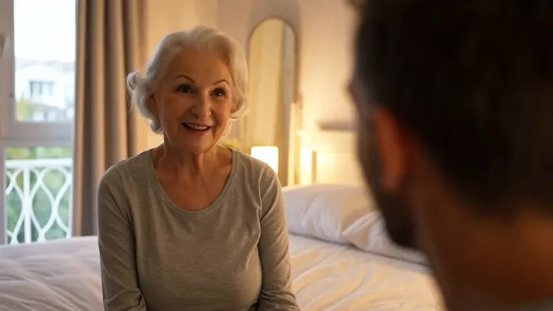 ☀️ Sunrise, daytime, soft lighting, side light, rim light, medium close-up, centered composition, warm tones. An elderly Caucasian woman sits on a white bed, wearing a gray cotton top. Her neatly brushed white wavy hair frames a gentle smile and kind eyes as she gazes softly in the direction of the camera, speaking with her son whose blurred silhouette appears on the right side of the frame. Sunlight streams through beige curtains, casting soft highlights on the bedsheets and walls. A white wrought iron window guard subtly outlines the window, enhancing the cozy and serene atmosphere. The camera focuses on the woman's upper body, with a softly blurred background to emphasize her emotional presence and the intimacy of the environment.
