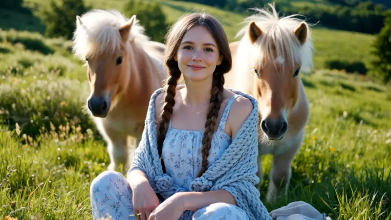 A girl around 20 years old sits in the grass, wearing a floral dress with braided hair draped over her shoulders and a pure, gentle smile. Behind her, two fluffy ponies stand quietly. Sunlight bathes the scene, creating a peaceful and poetic countryside ambiance.
