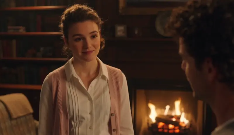 Filmed over the shoulder, a girl wearing a white shirt and pink vest stands in front of a fireplace, looking toward someone to the right of the camera.