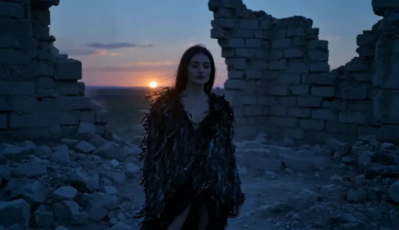 "A girl surrounded by ruins, wearing a tattered feathered robe, standing in the dusk, with the camera slowly zooming in on her closed eyes."