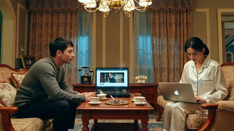 🌌 Late at night under dim yellow lighting, a man and woman sit at a dining table in conversation, captured with a wide-angle, full-frame shot. The man wears a gray knit sweater and black pants, attentively watching the woman across from him, who is dressed in white pajamas and casually holding a laptop as if streaming a show. The room is decorated with retro furniture and lighting fixtures, evoking a vintage mood. A low-hanging chandelier, patterned curtains, and scattered household items complete the lived-in ambiance. Overhead and mixed soft lighting bring out a saturated nighttime atmosphere. The composition is symmetrical and steady, preserving a quiet moment filled with subtle emotional tension.
