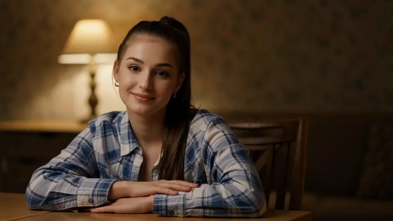 A girl in a blue and white checkered shirt sits in a dimly lit room, her ponytail draping down, smiling softly at the camera. A desk lamp gently illuminates her face while the background is blurred, creating a quiet and restrained emotional mood.
