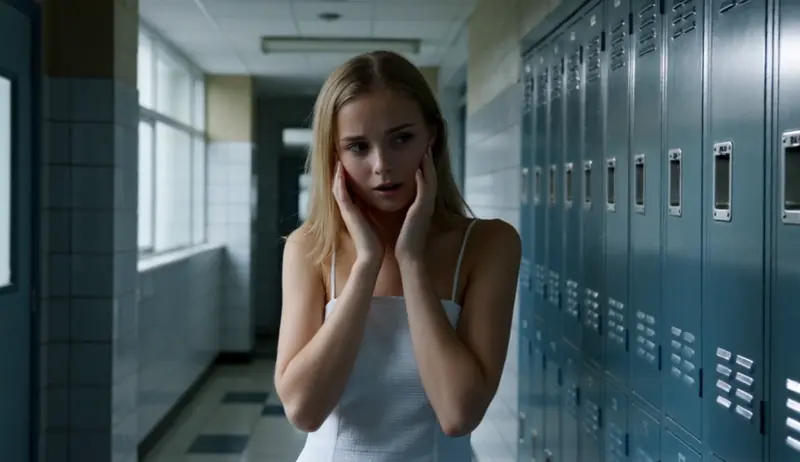 A blonde young woman stands in a school hallway lined with blue lockers. Wearing a white tank top, she covers her face with both hands, showing subtle anxiety while glancing to the side. The weak top and side lighting casts soft shadows, while gray-blue walls and a narrow frame enhance the sense of stillness and restraint.