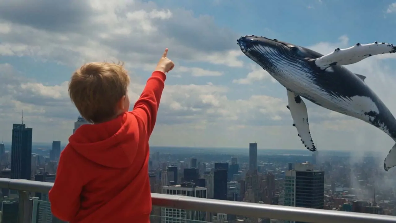 (A Hollywood movie, a low-angle shot focuses on a thin boy, about five or six years old, wearing a bright red hoodie. He stands on the edge of a skyscraper roof, right arm extended, index finger pointed firmly at the sunny sky. Following the direction of his finger, above the city, a gray-blue humpback whale, the size of a mountain, slowly swims by. Its skin is covered with realistic barnacles and wrinkles, its belly has a cold metallic sheen, and its huge tail fin stirs up a visible airflow, swirling with rain and mist.)
