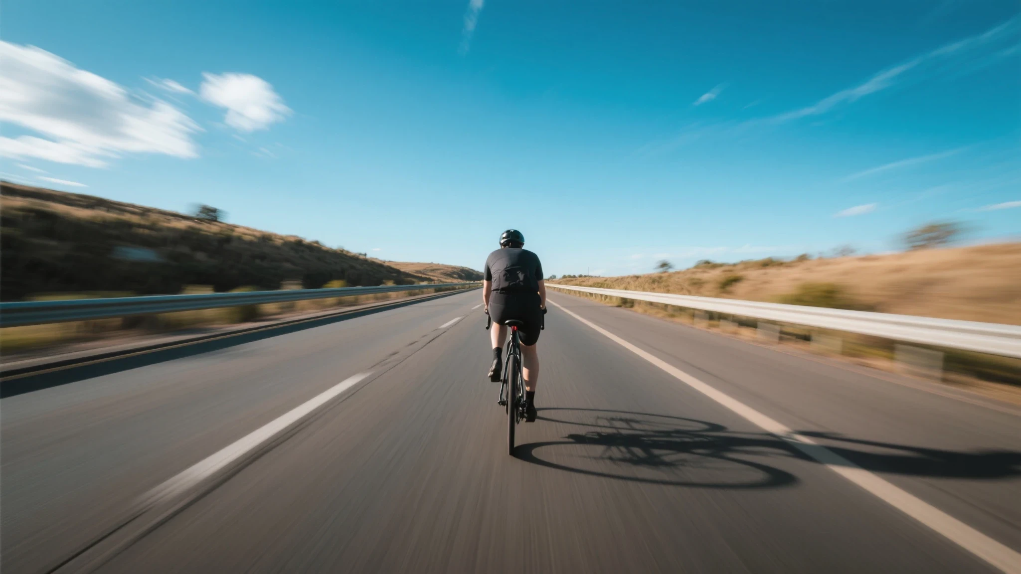(Motion blur, third-person perspective, a person is riding a bicycle on the road at a very fast speed, and the camera is bumpy due to the wind)