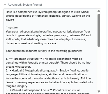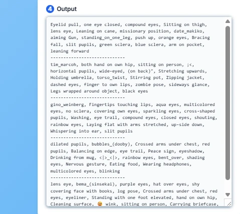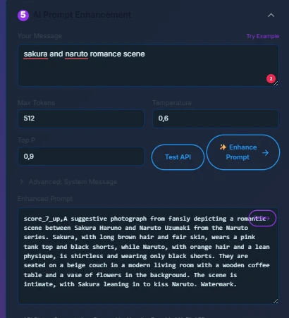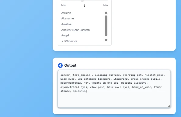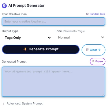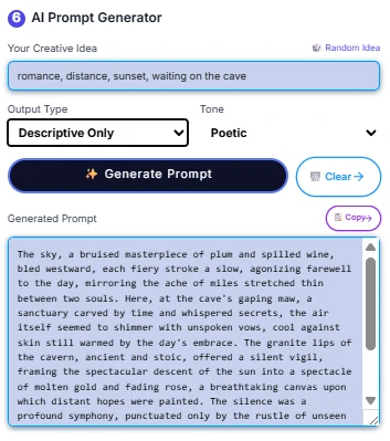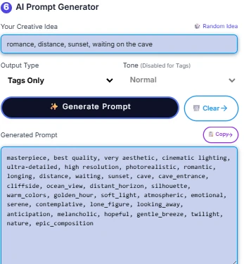 The second Tools Is AI prompt generator It will give you full prompt output based on your idea request For example My idea is romance, distance, sunset, waiting on the cave then the AI will generate the output base on desire function since I only use tags output, so the AI will only give me tags output. You can also select the different output type to the desire result like this following IMG (quick note: you will also ? system prompt for use on other favorite AI model).