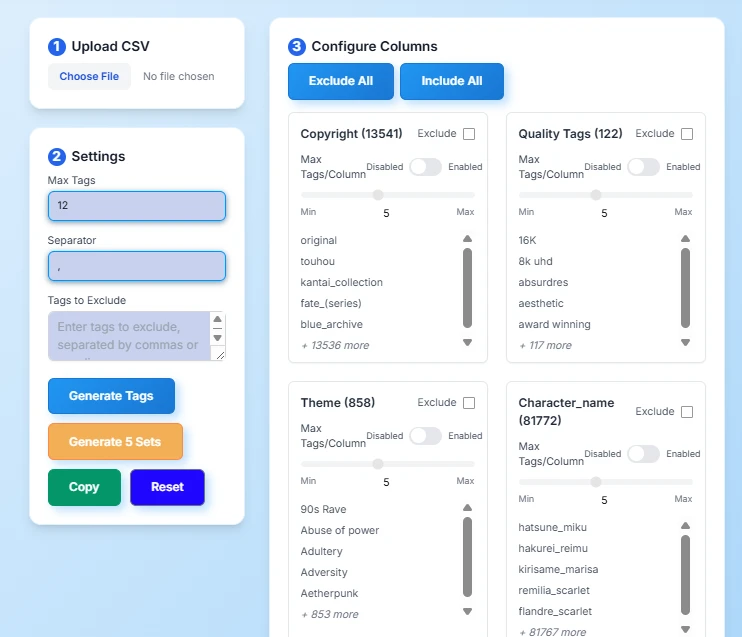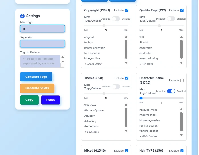The first tools are tags Mixer, this tools is helping you to generate random Tags idea based on column data, by default this is included all column to generate all mixed tags' idea, you can also click the exclude checkbox if you want to create some specific Idea, you can also set the maximum tags to your decided value for example I only want to use character, clothing, expression, pose,  and quality tags, and Artist first I exclude all column So I can easy to manage what I want, second I set the maximum tags to 18 So the machine will only generate 18 tags idea for me