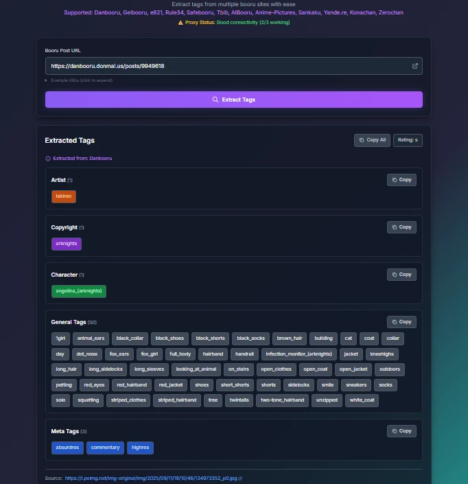 The last tools it is data extractor for specific website it will give you extracted metadata tags output from specific website for example I can extract all tags from specify danbooru img pages with single click without writing long tags and Create AI IMG directly using this tags