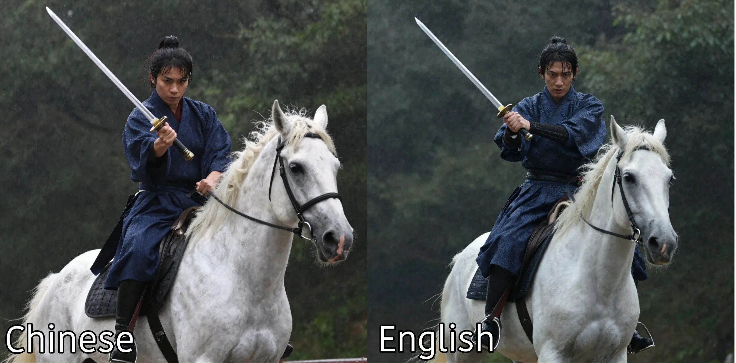 prompt: a samurai, riding a white horse, holding a long sword, raining, forest background, cinematic, dynamic front angle