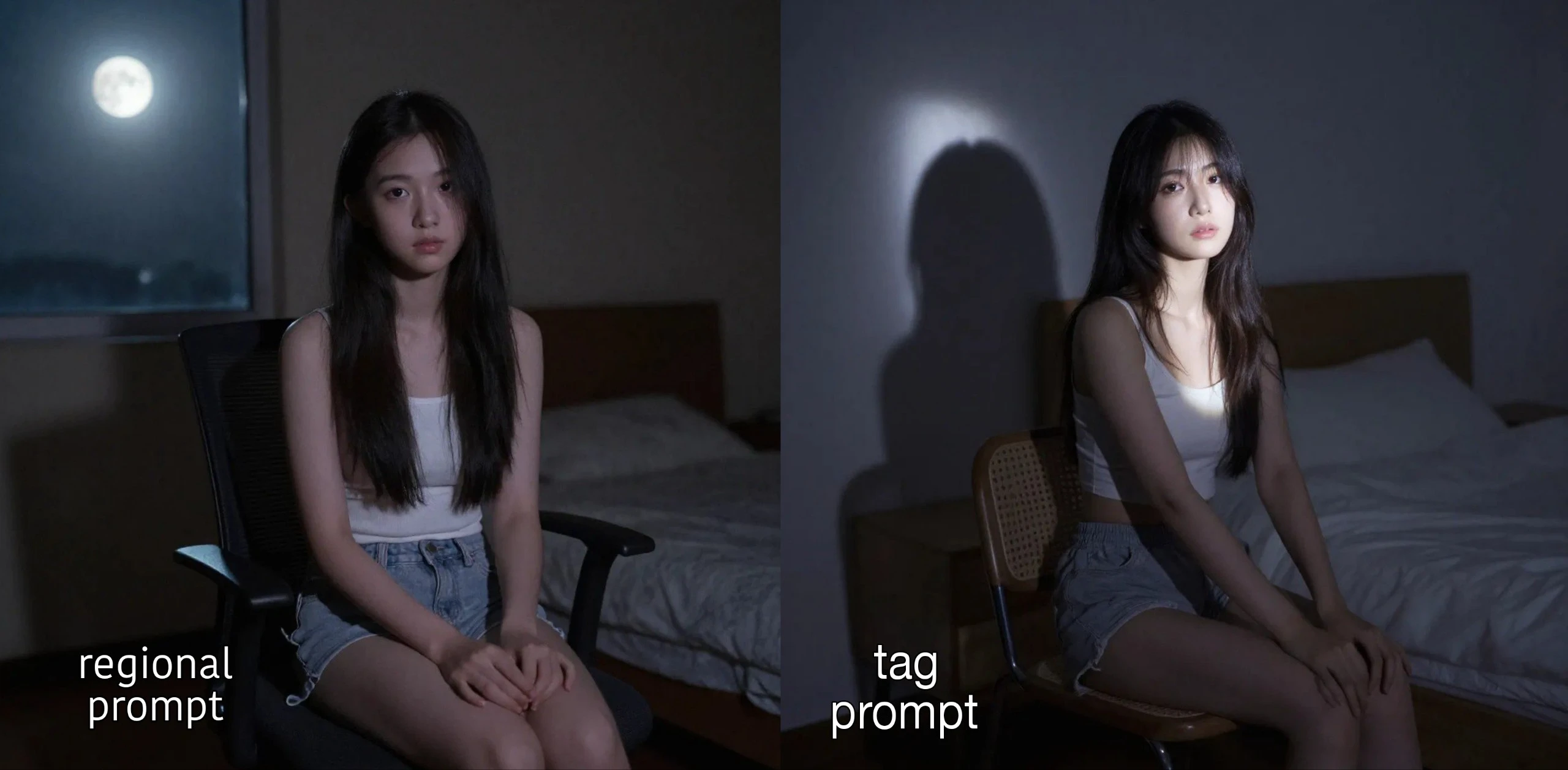 b. [more effective]-" girl, sitting on chair, looking front, mid-shot, dark room, night time, moon light "