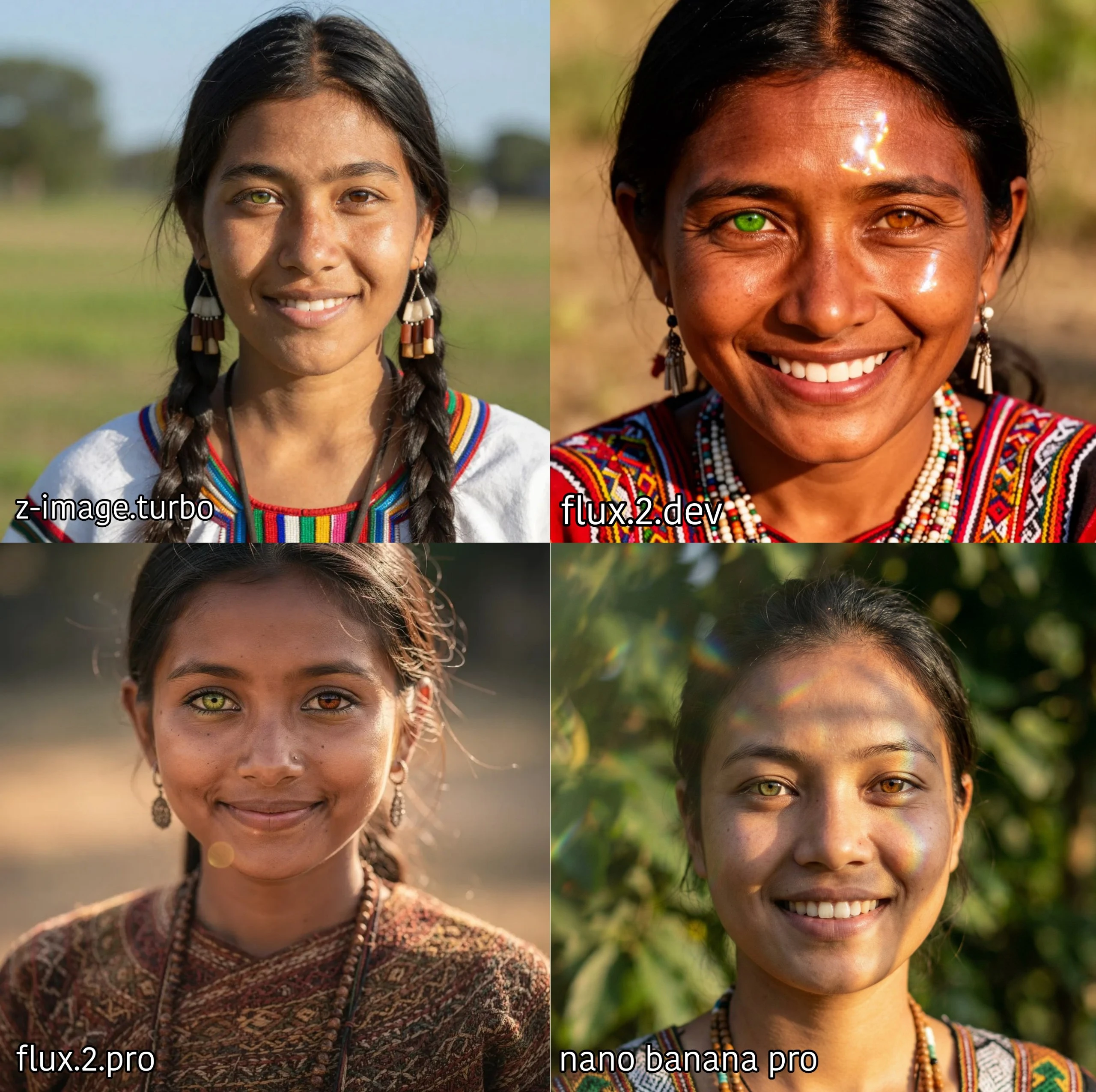 test-1 = 20yr old northeast indiana tribal lady, tribal clothes, smiling, camera angle upto chest, "olive green right eye", "caramel brown left eye", real life based image, clear, hd image, non blurry,, camera focused on eyes, sunlight refracting on face