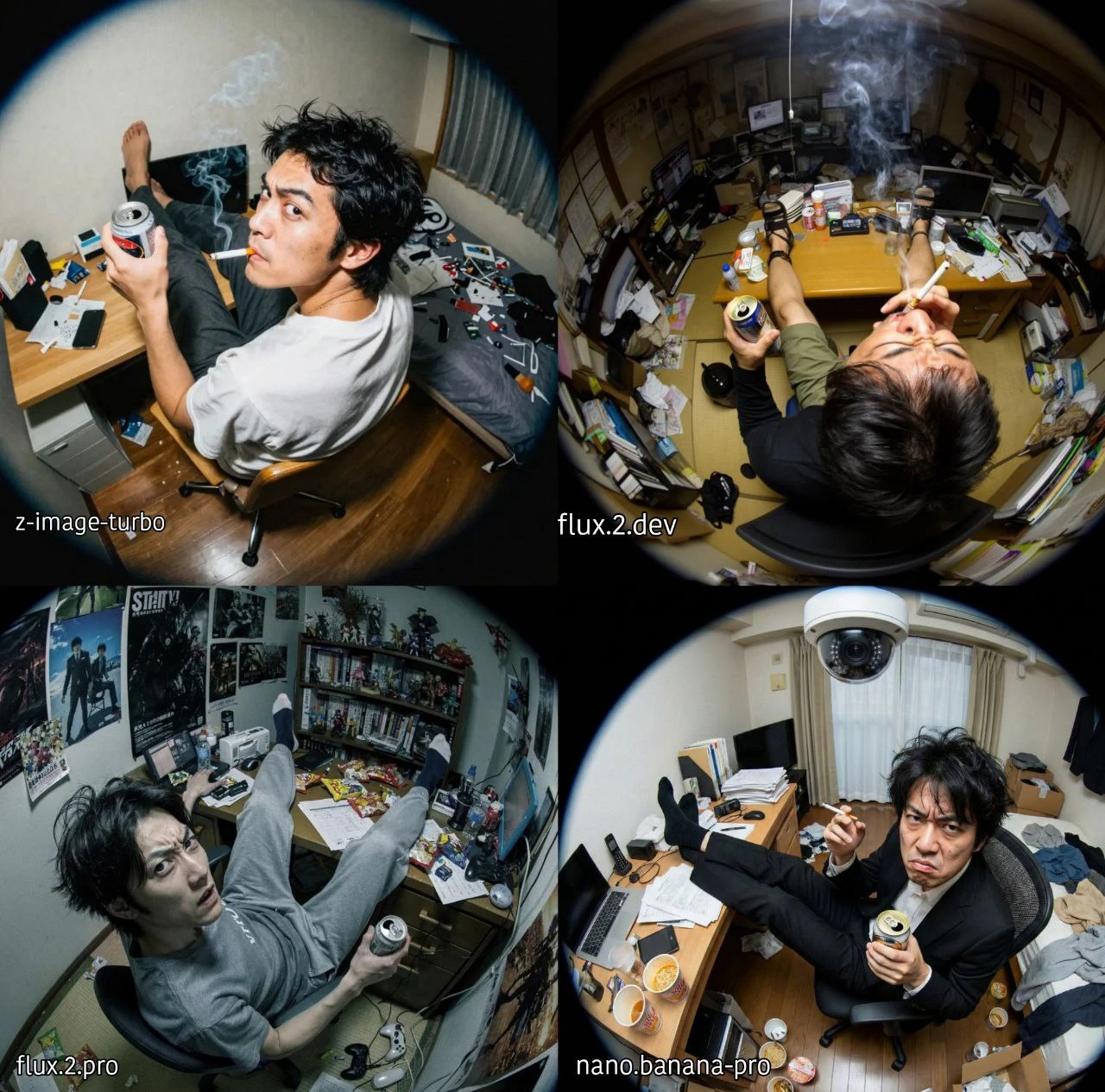 TEST-3 = a japanese male, sitting on chair, both legs over desk, "smoking ciggratte", back view, holding beer can on one hand, looking directly up toward camera, irritated expression, messy room, captured from a high far overhead camera angle, fish eye lens, curved edges, exaggerated perspective
