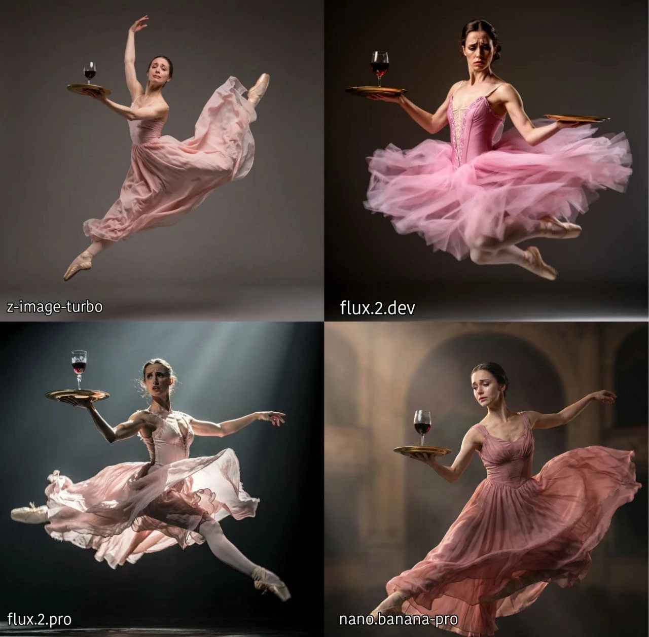 TEST-4 = female ballet dancer performing in mid-air, full body visible, wearing a flowing pink ballet dress, holding a golden plate in one hand with a wine glass filled with red wine, sad emotional expression, camera focused tightly on her sad face while capturing full body motion, dramatic cinematic lighting, dynamic pose with dress fluttering, graceful movement frozen mid-leap, high detail fabric textures, realistic shadows, soft volumetric light, elegant atmosphere, high resolution, dramatic composition