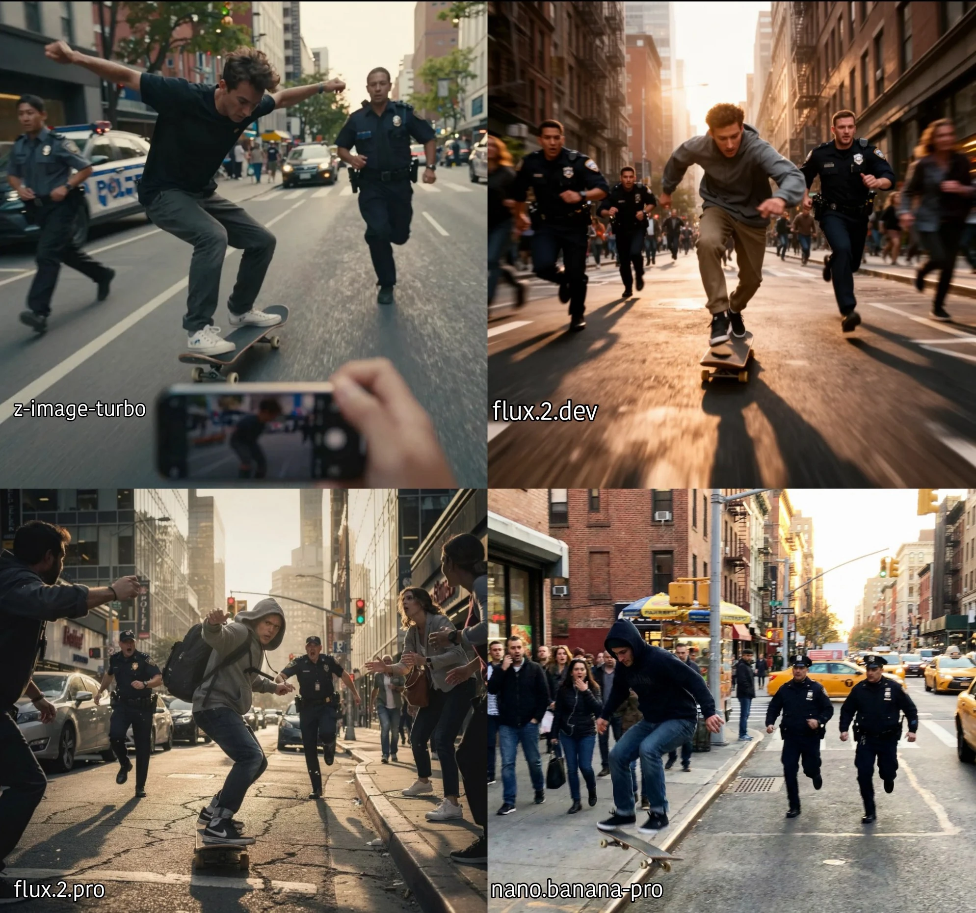 TEST-7 = street skateboarder escaping police chasing him, high-speed action, cinematic urban scene, dramatic motion blur, dynamic angle, captured from a random NPC’s phone camera, slightly shaky handheld feel, late afternoon street lighting, realistic city environment, police running behind, skateboarder weaving through pedestrians, intense expressions, gritty modern look, high detail, natural colors, sharp focus on subject, sense of urgency and movement