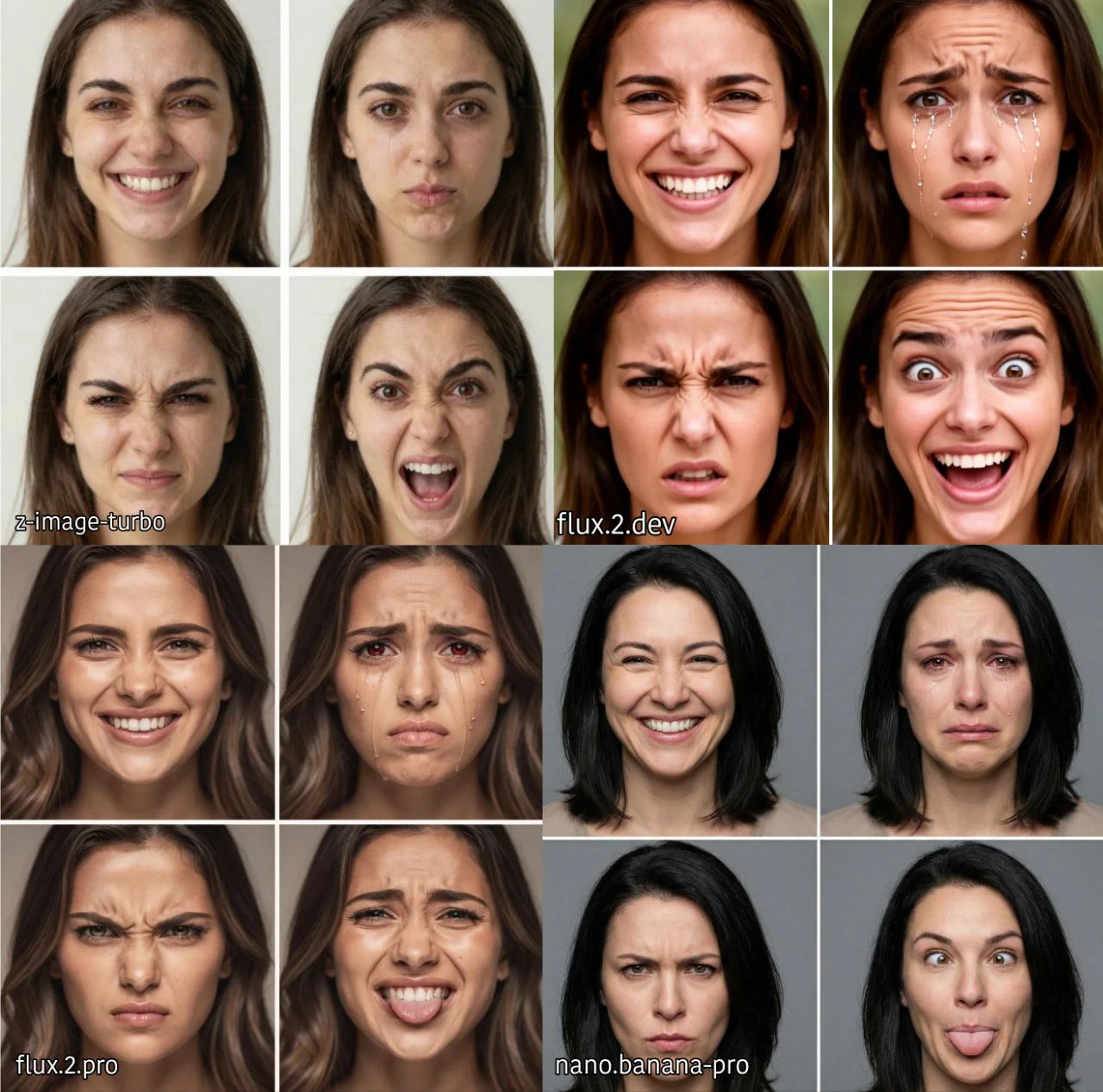 TEST-5 = four portrait images of the same woman, consistent face, 1st image happy expression, 2nd image crying expression with tears, 3rd image angry expression, 4th image goofy playful expression, high detail facial features, sharp focus, natural colors, portrait style, high resolution