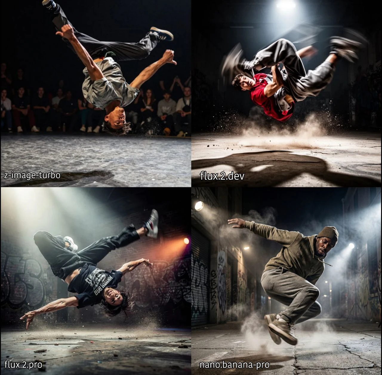 test-6 = person performing a complex breakdance move mid-air, extreme dynamic pose, powerful body twist, strong muscle tension, cinematic low-angle shot, dramatic motion blur on limbs, crisp focus on the dancer’s face, urban street setting with concrete floor, scattered dust kicked up from movement, intense stage-like lighting, volumetric shadows, high-contrast highlights, dynamic composition, energetic atmosphere, realistic clothing folds, detailed textures, high resolution, action-packed visual impact