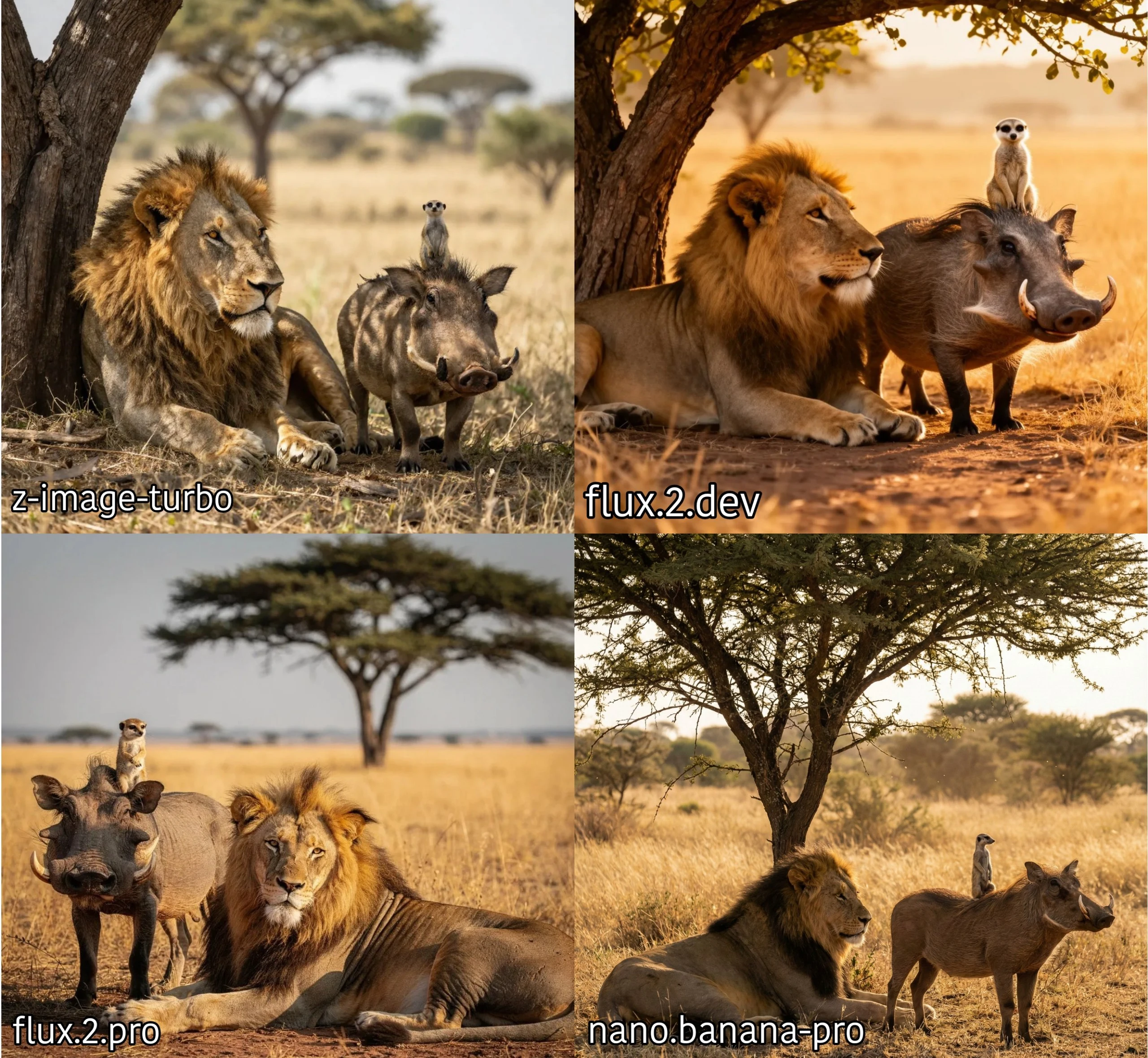 TEST-2 = lion resting under a tree, realistic wildlife, savannah environment, sunny warm lighting, warthog beside lion, warthog alert and looking around, meerkat standing on warthog’s back, natural colors, detailed animal fur, cinematic composition, National Geographic style, high resolution, sharp focus