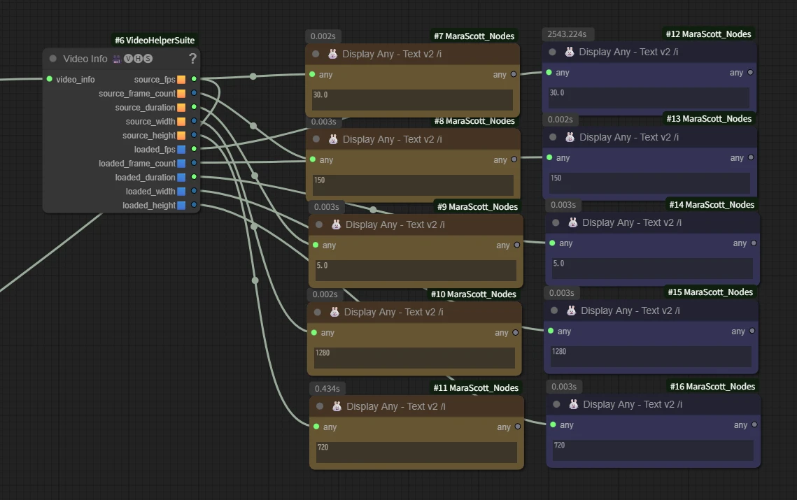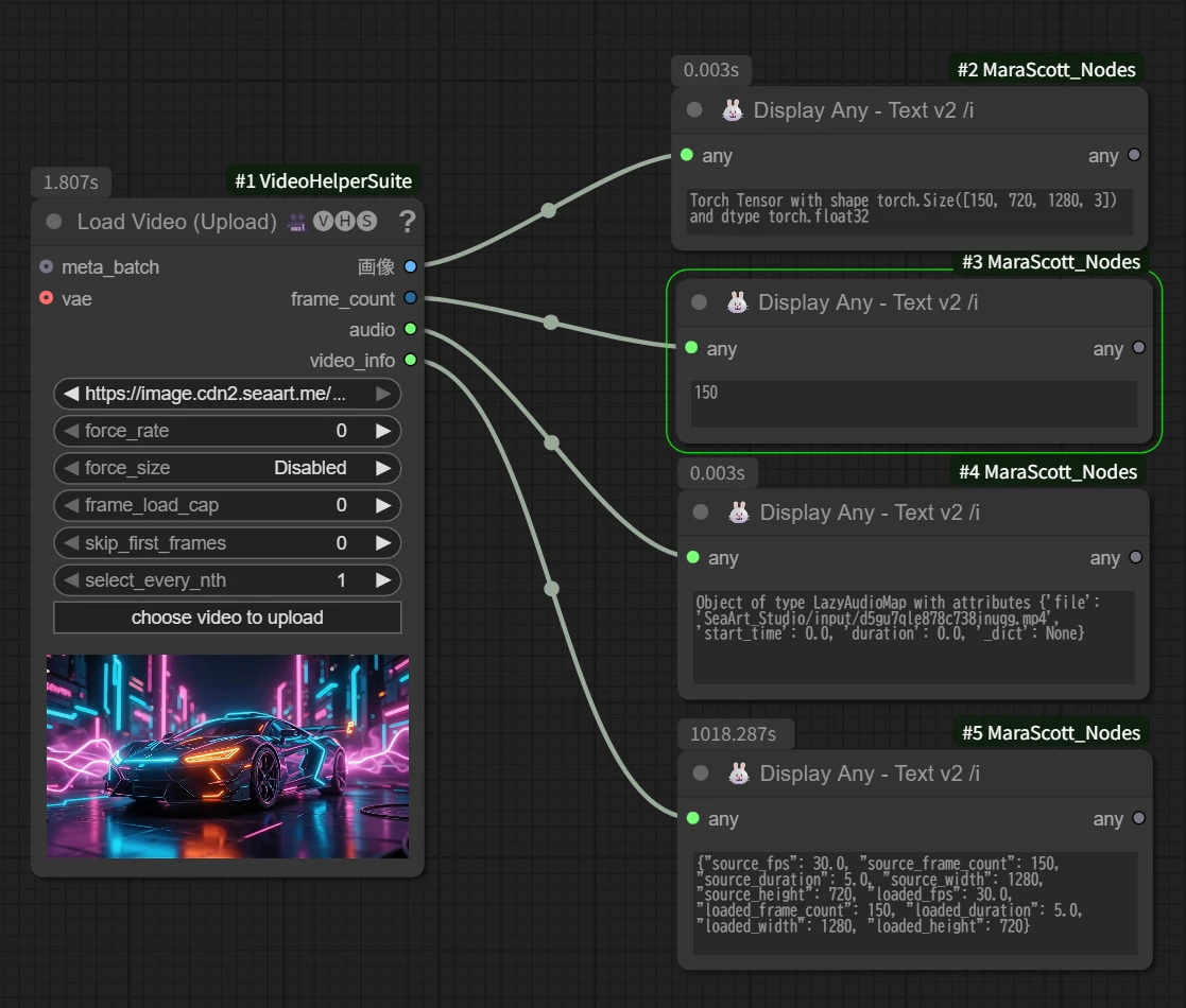 • Video Info : アップロードした動画の情報を取得します。(このワークフローでは【fps】を自動取得するために追加しています。)
