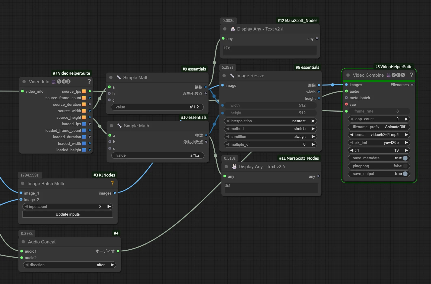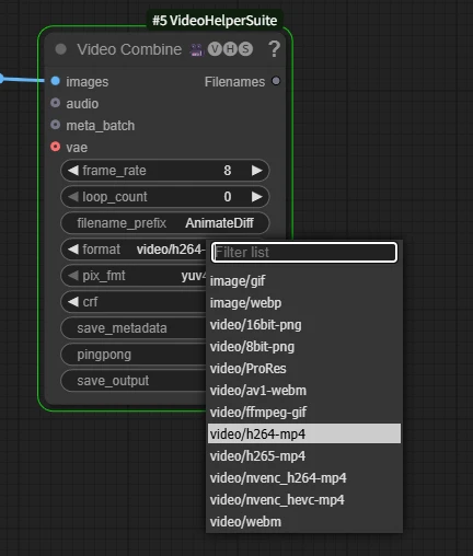 このノードはビデオ結合するだけなら必須ではありませんが、生成に使用したビデオモデルにより[ fps ] が異なる場合などがあるため、ここからのノード出力を使用することで、データ保存時の数値指定の自動化が可能になります。