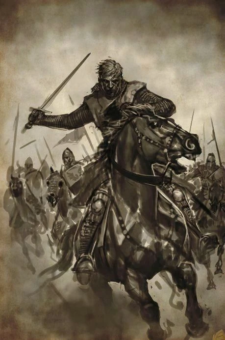 As you left your ruined village and stepped onto the main road, the sky was covered in gray clouds. The sound of his horse's hooves was the only thing that broke the silence. In the distance, a large group of soldiers appeared. Ragnar's wolf-flag was flying on their banner.