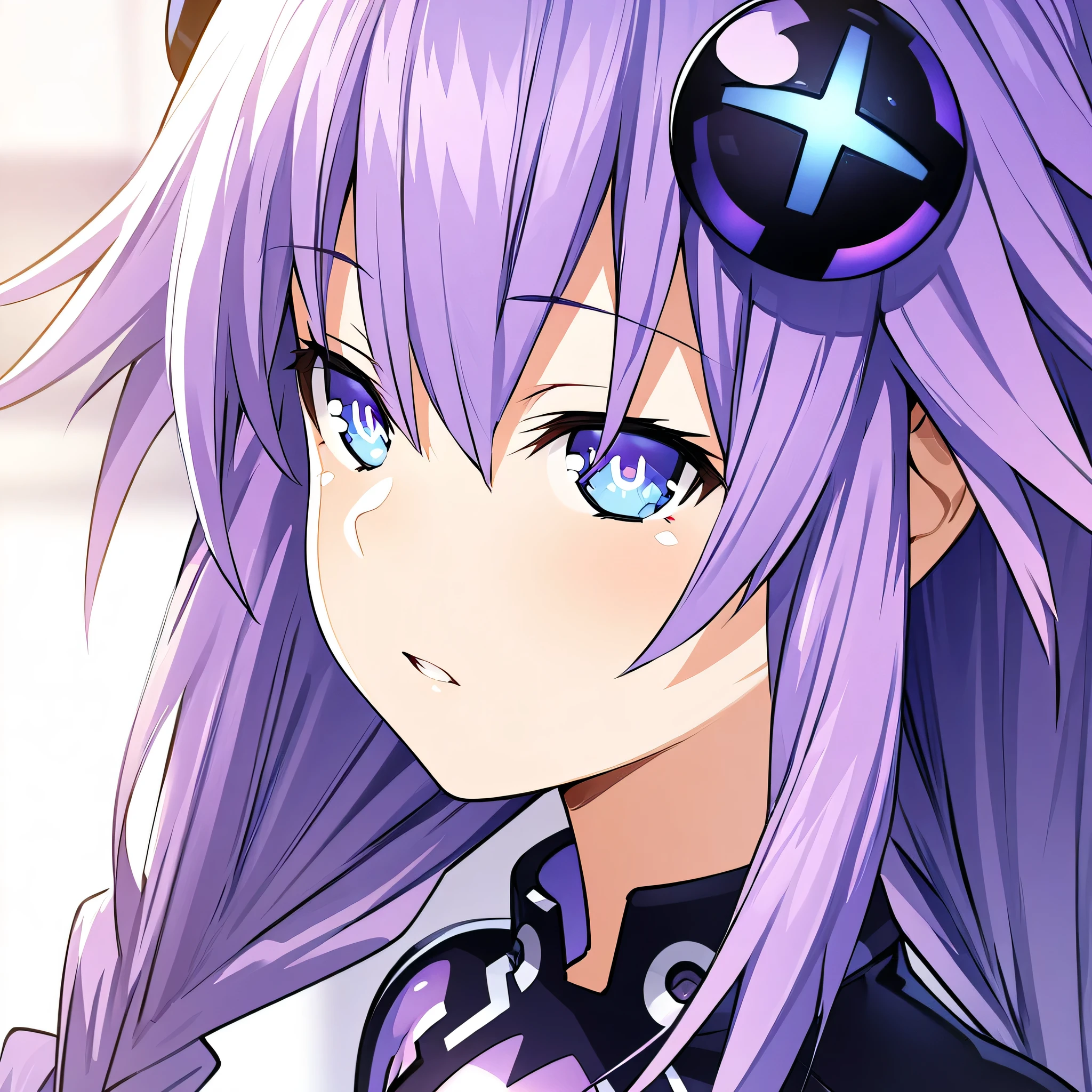 purple heart, purple hair, purple eyes, braid, hair ornament, symbol shaped pupil, power symbol,