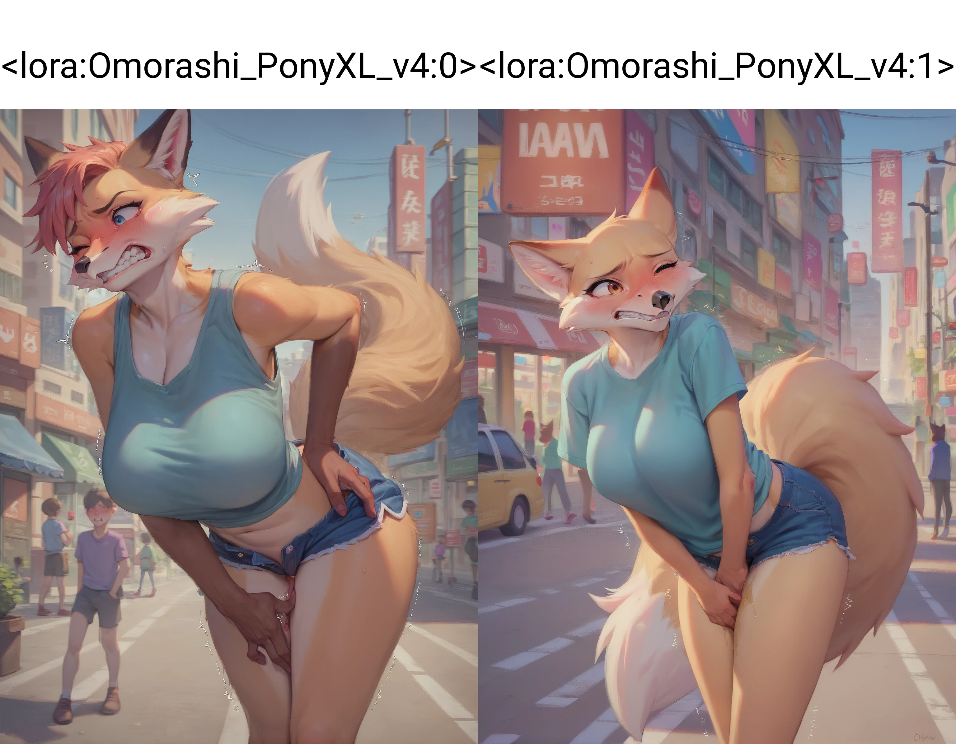 This LoRA aims to enhance qualities of ???????? that don't really work very well in PonyXL, such as crotch-holding, leaking, desperation faces, etc. I've mostly made it since I'm not quite satisfied with the ???????? images I can make using Ponyxl at the moment - The trigger is omorashi, though desperation should be added as well.