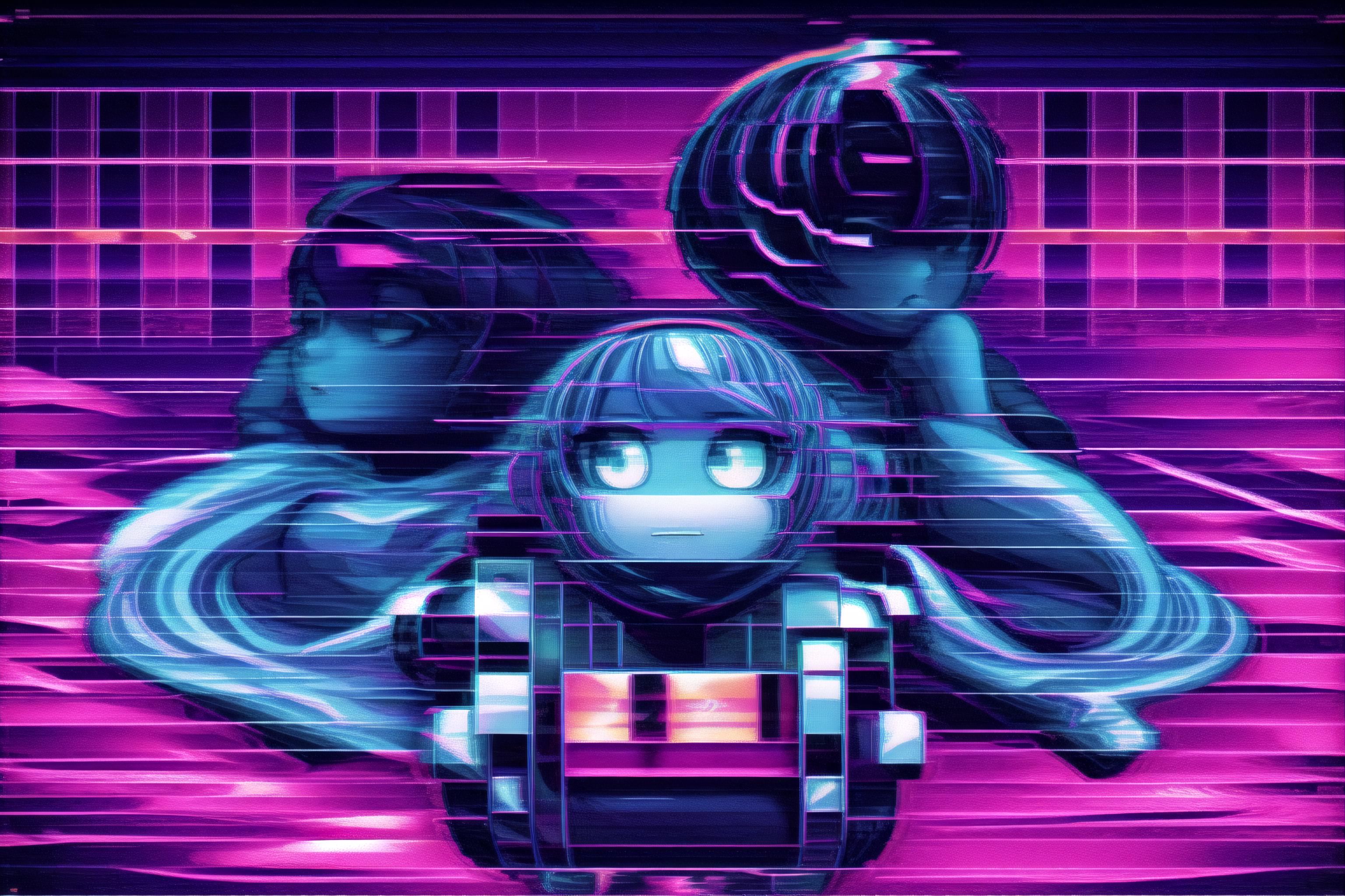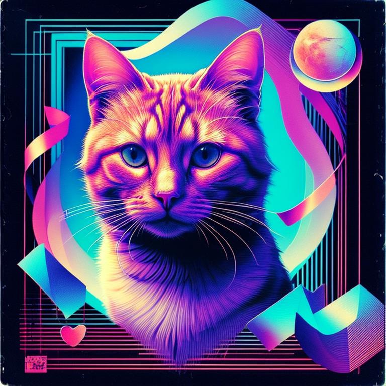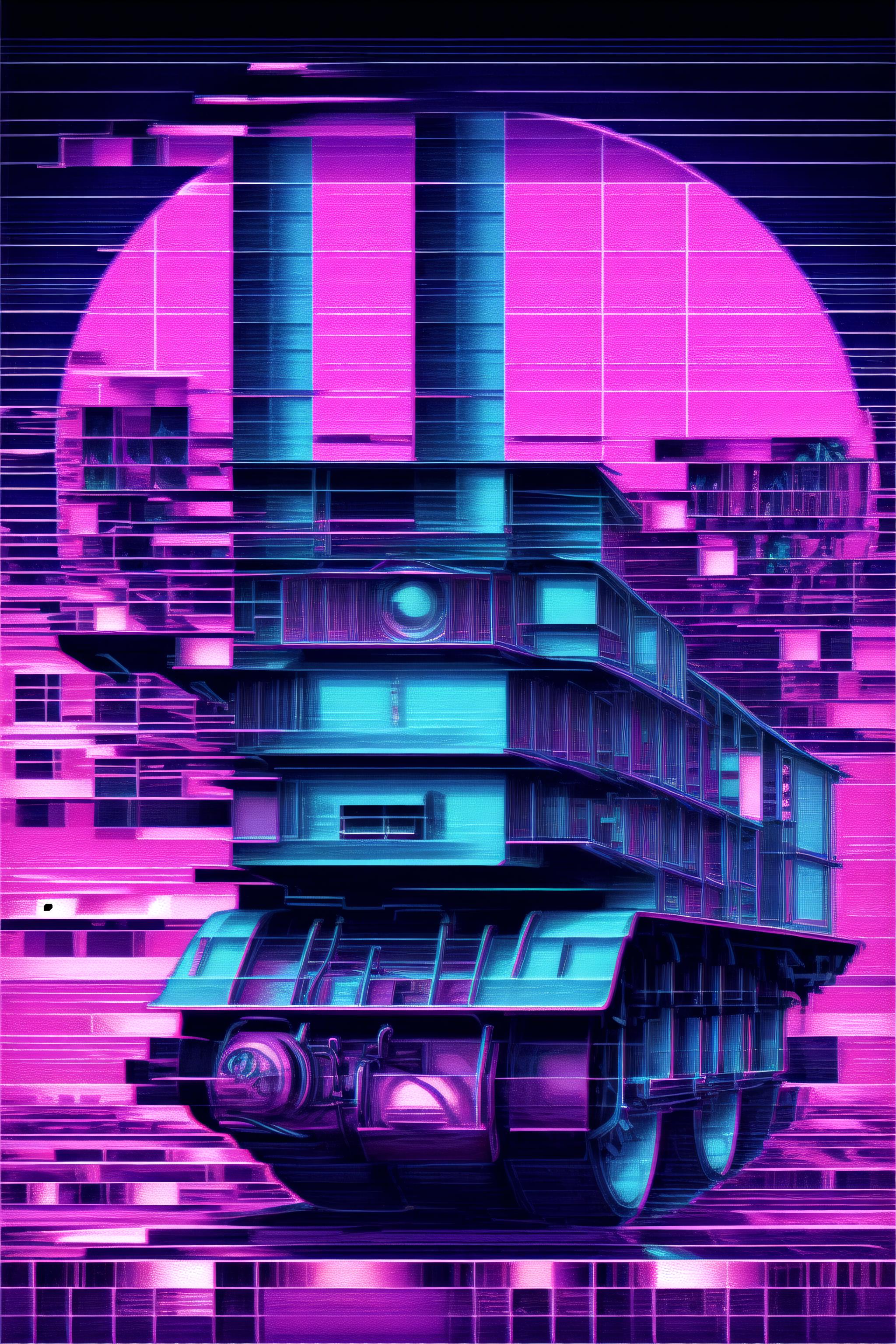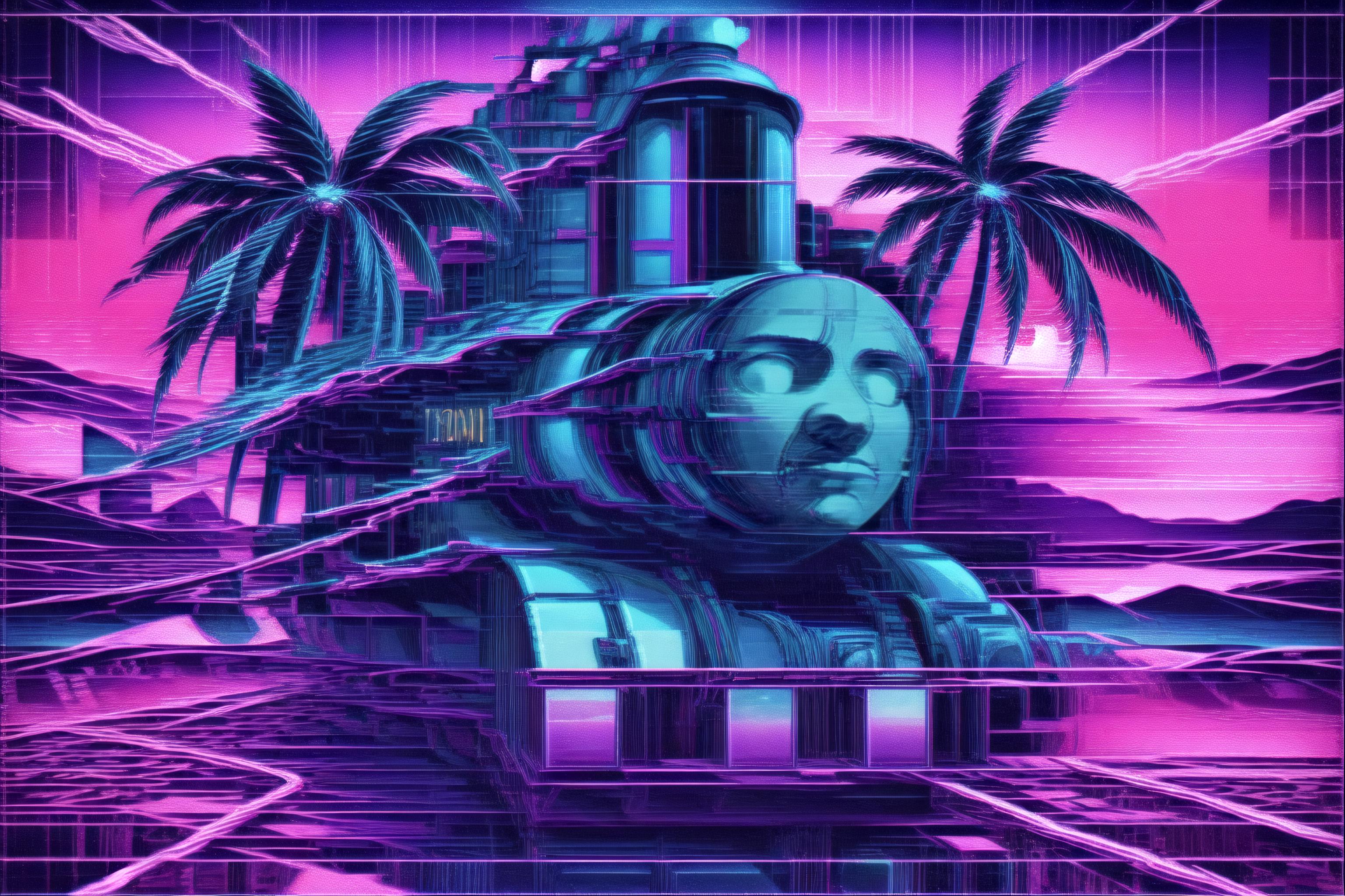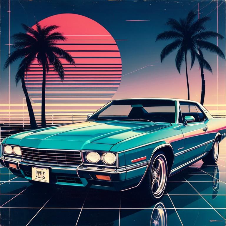 vaporwave style, Short-haired fashionable girl, wearing sunglasses, earrings, and a sweater, with a background of palm tree, and a sunset.<lora:vaporwave:0.7>