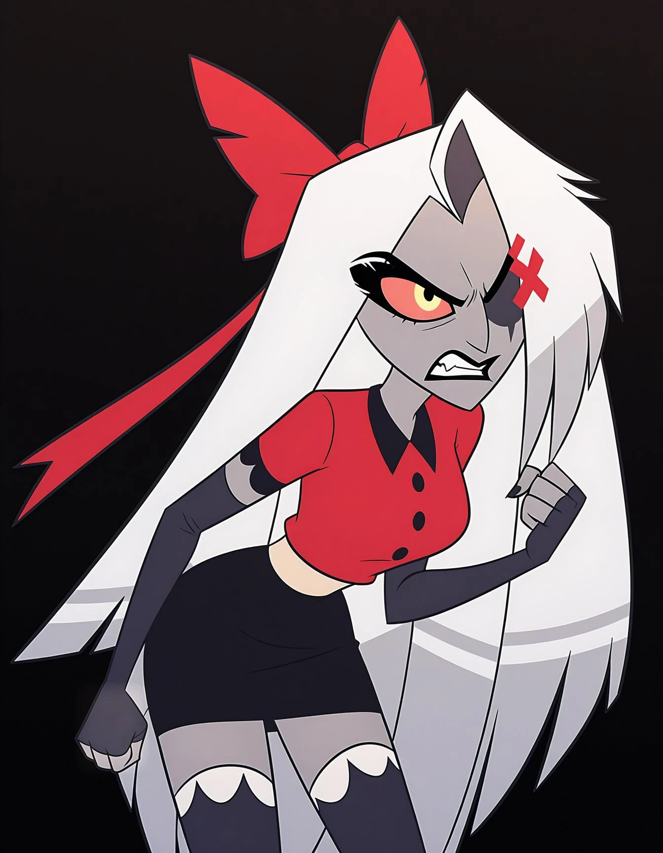 animated, stylizedOutfit: crop top, elbow gloves, fingerless gloves, belt, miniskirt, thighhighs