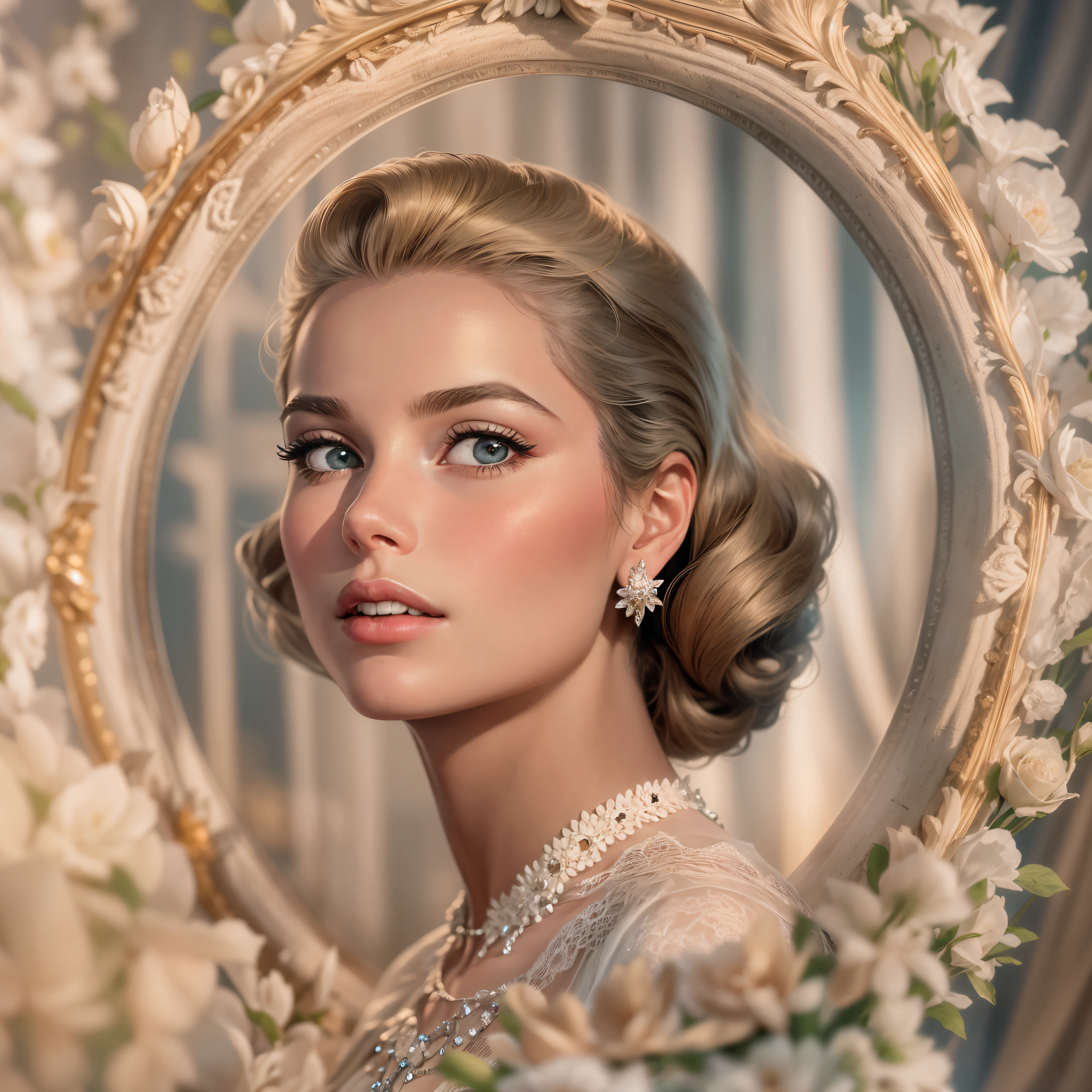 Arafed image of a woman in a dress and a necklace looking into a mirror
