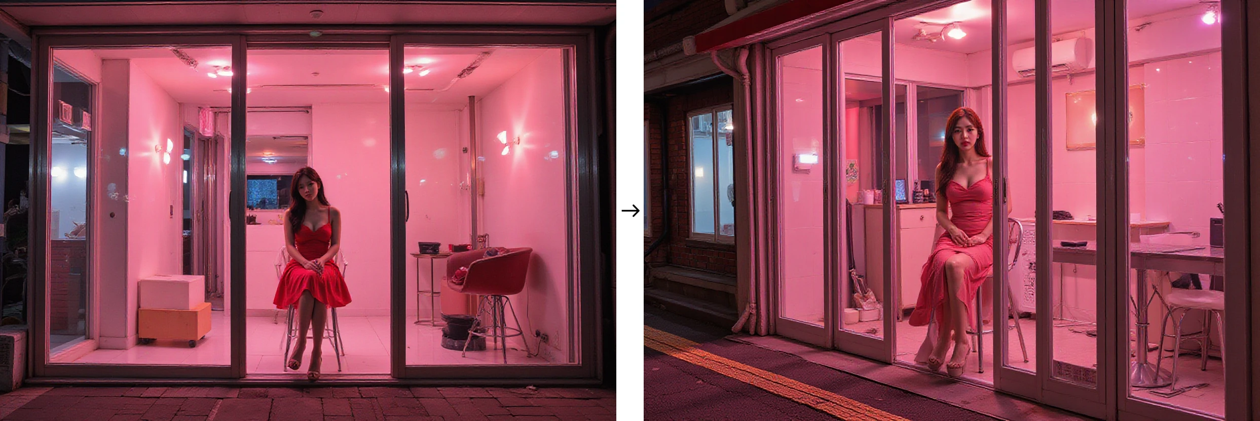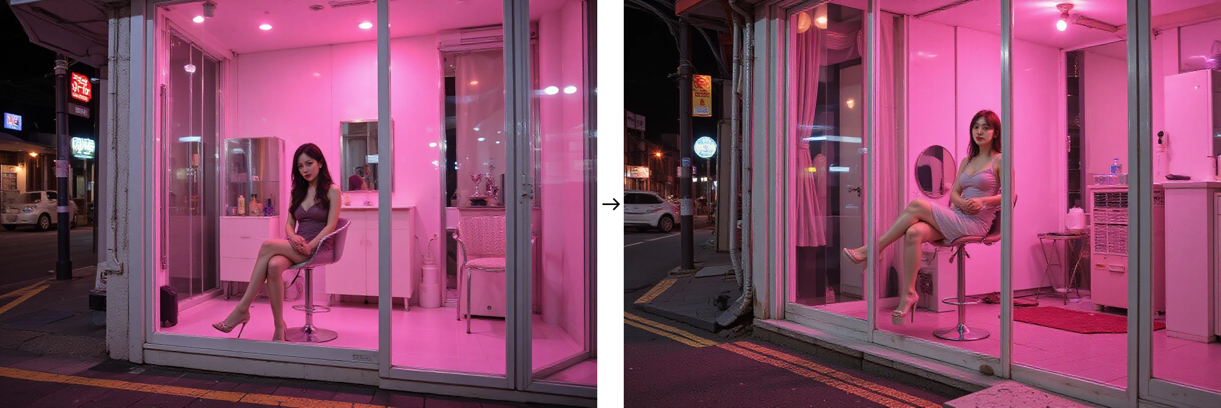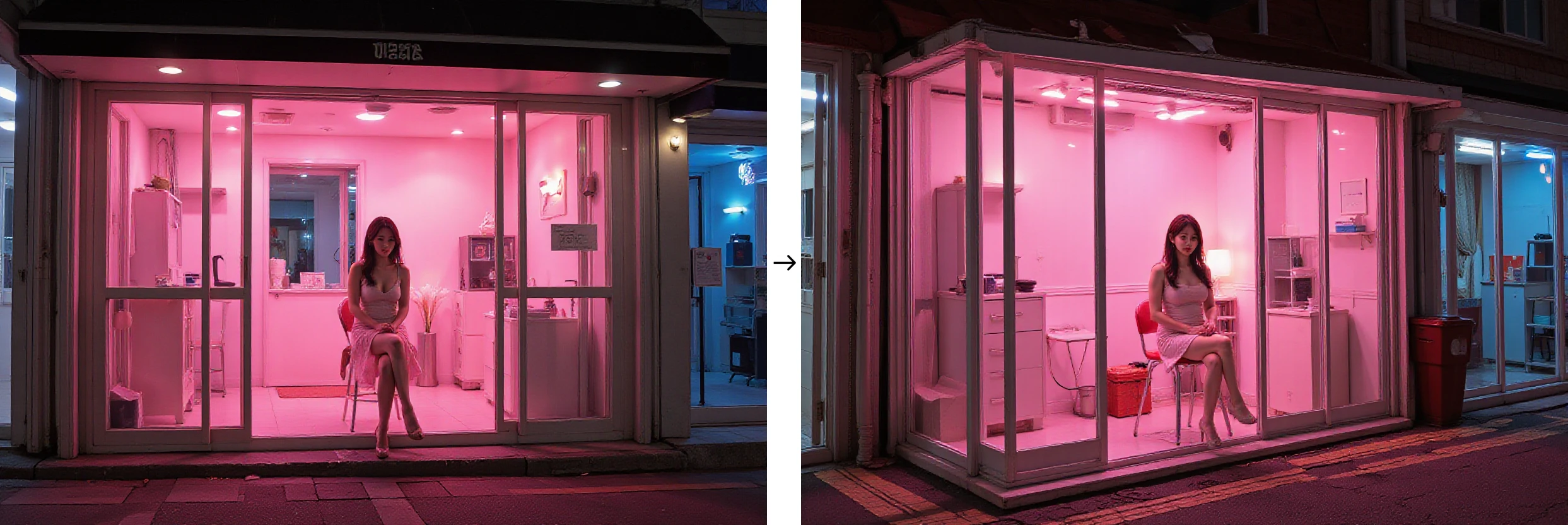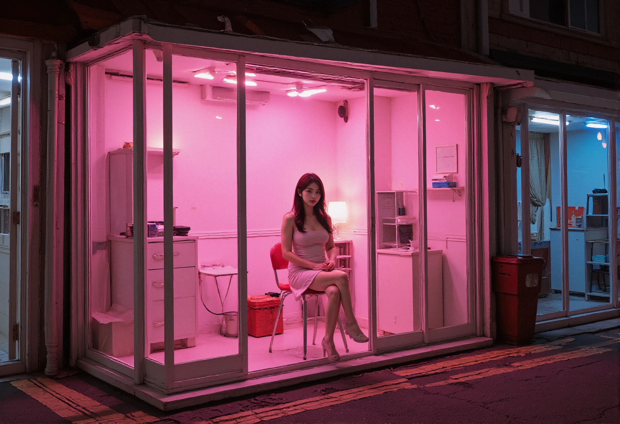 ????????????, girl inside a storefront, whore, girls and storefront's interioris are visible through its large glass windows, the storefront with large glass door and white frame, the storefront with glass display window,