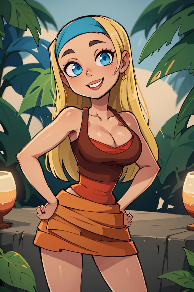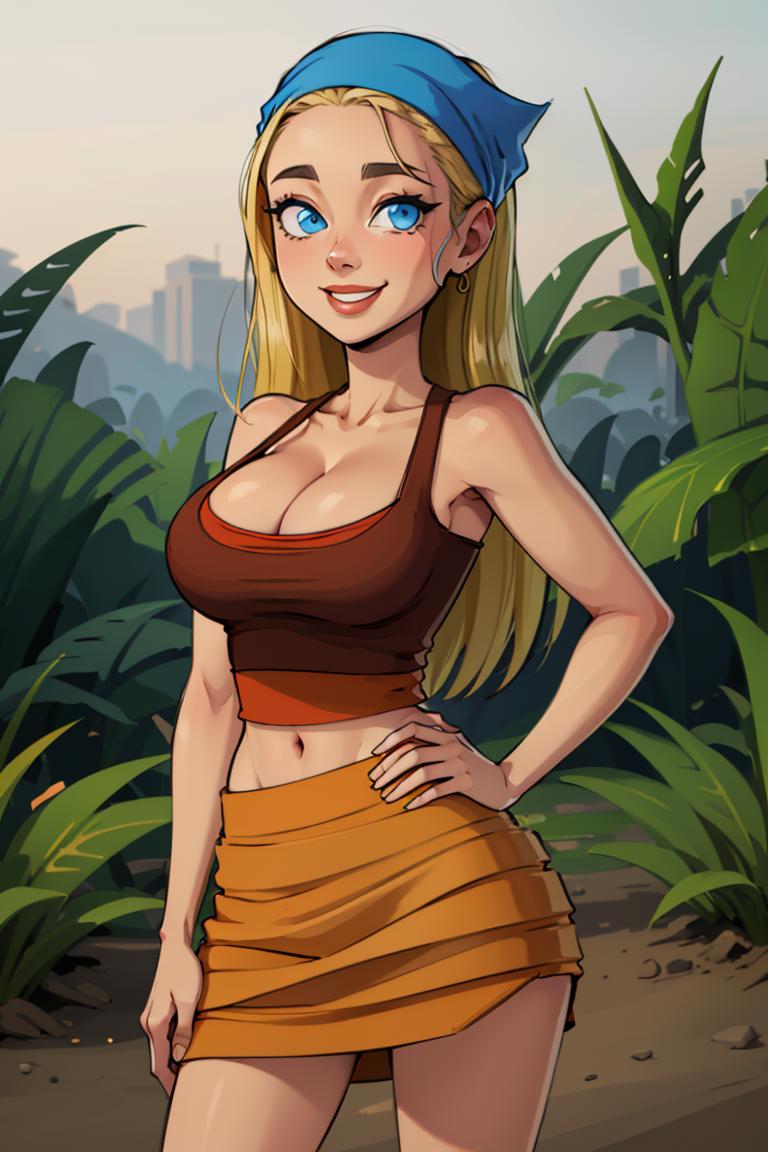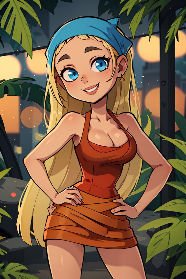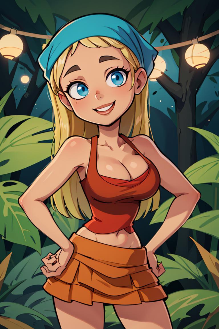 Lindsay_Total_Drama, 1girl, solo, blue eyes, long hair, blonde hair, ?????????????, cleavage, bandana, skirt