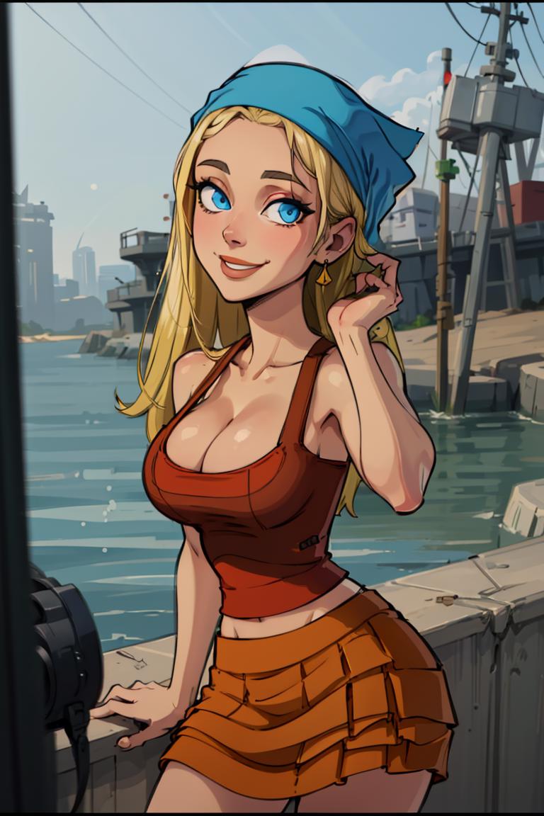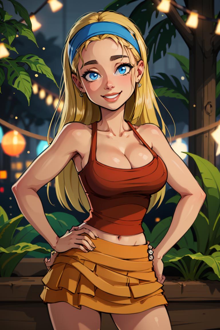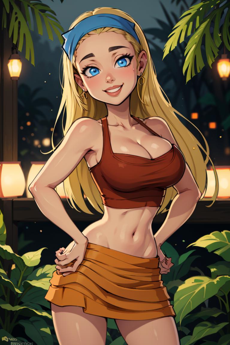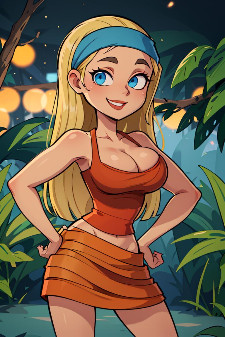 Lindsay_Total_Drama, 1girl, solo, blue eyes, long hair, blonde hair, ?????????????, cleavage, bandana, skirt
