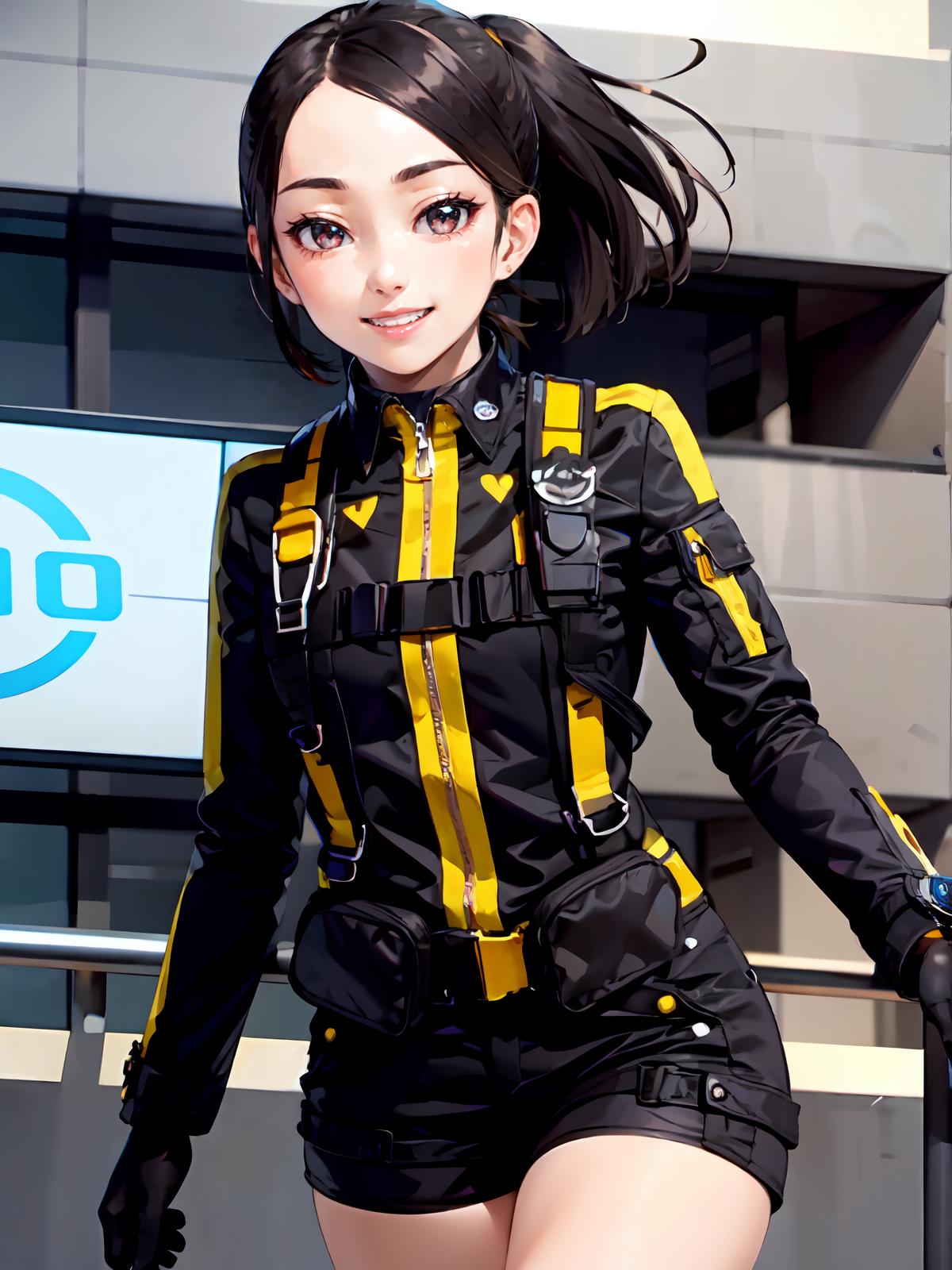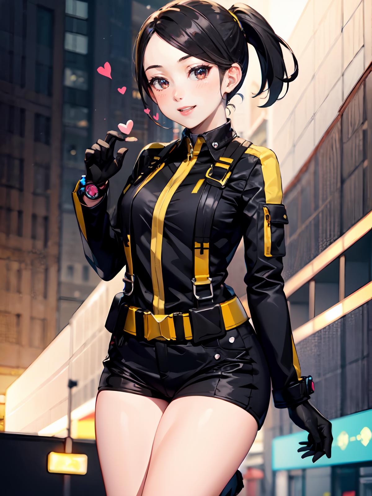 Prompts: black gloves,wristwatch,black eyes,short shorts,black shorts, boots, gloves, ponytail,jacket,shorts, black hair,long hair
