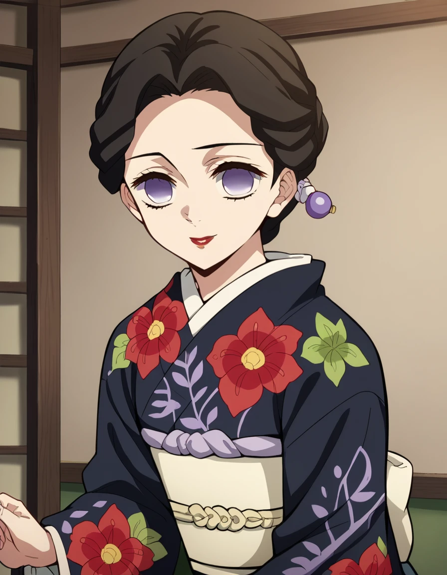 tamayo, black hair, hair ornament, purple eyes, empty eyes, short hair, makeup, lipstick, red lips,